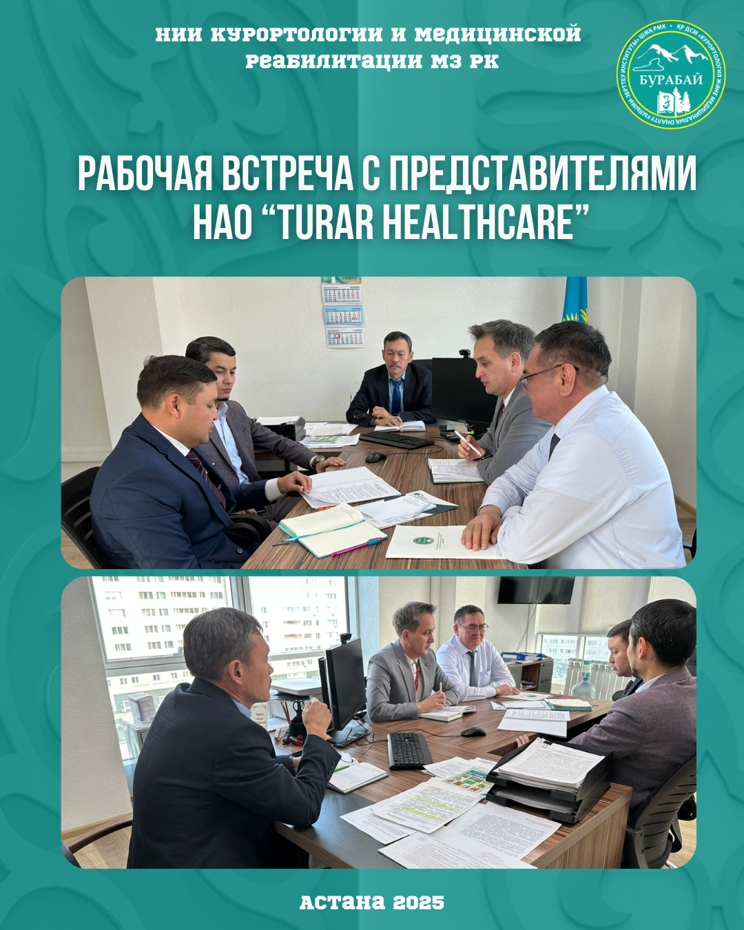 4 ноября 2025 года в НИИ курортологии и медицинской реабилитации Министерства здравоохранения Республики Казахстан состоялась рабочая встреча заместителя директора по организационно-методической работе Каната Текебаева и заместителя директора по экономическому и административно-хозяйственному обеспечению Нурлана Нысамбаева с представителями НАО «Turar Healthcare» — заместителем председателя правления Санджаром Раисовым и главным проектным менеджером департамента планирования объектов инфраструктуры здравоохранения Алишером Ерболовым.