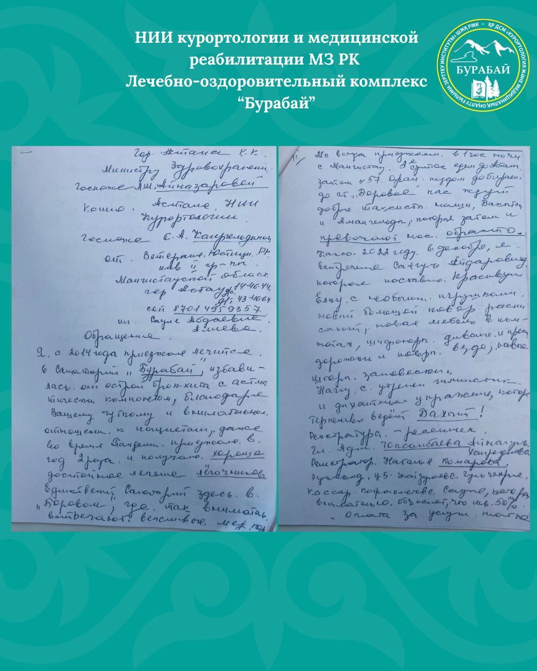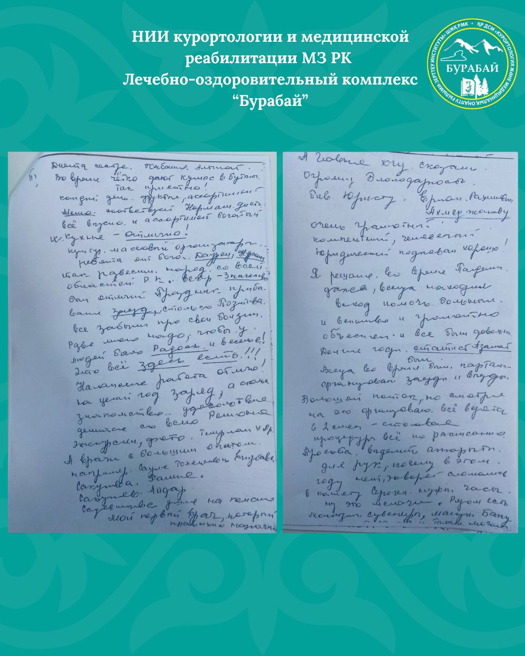 В филиале НИИ курортологии и медицинской реабилитации МЗ РК в лечебно-оздоровительном комплексе "Бурабай" лечение будет сочетаться с полноценным отдыхом. Особенно приятно, когда наши гости делятся своими теплыми пожеланиями. Сегодня мы публикуем письма пациентов, успешно прошедших курс лечения. Спасибо, что выбрали нас!