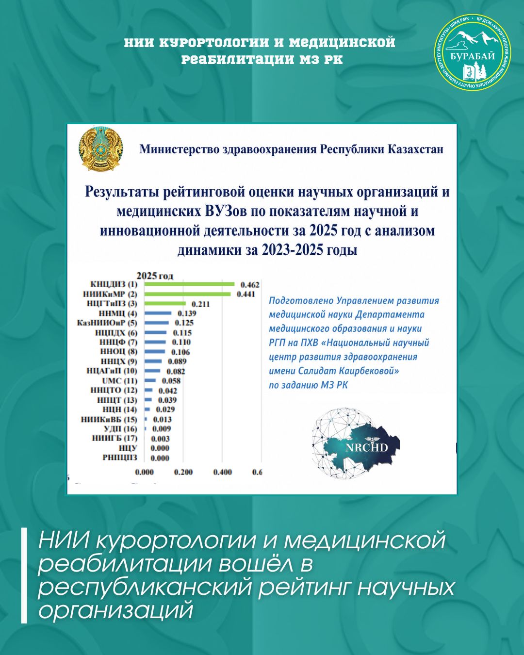 По итогам рейтинговой оценки научных организаций и медицинских вузов Республики Казахстан за 2025 год, проведённой Национальный научный центр развития здравоохранения имени Салидат Каирбековой, НИИ курортологии и медицинской реабилитации МЗ РК вошёл в число организаций, оценённых по ключевым показателям научной и инновационной деятельности.