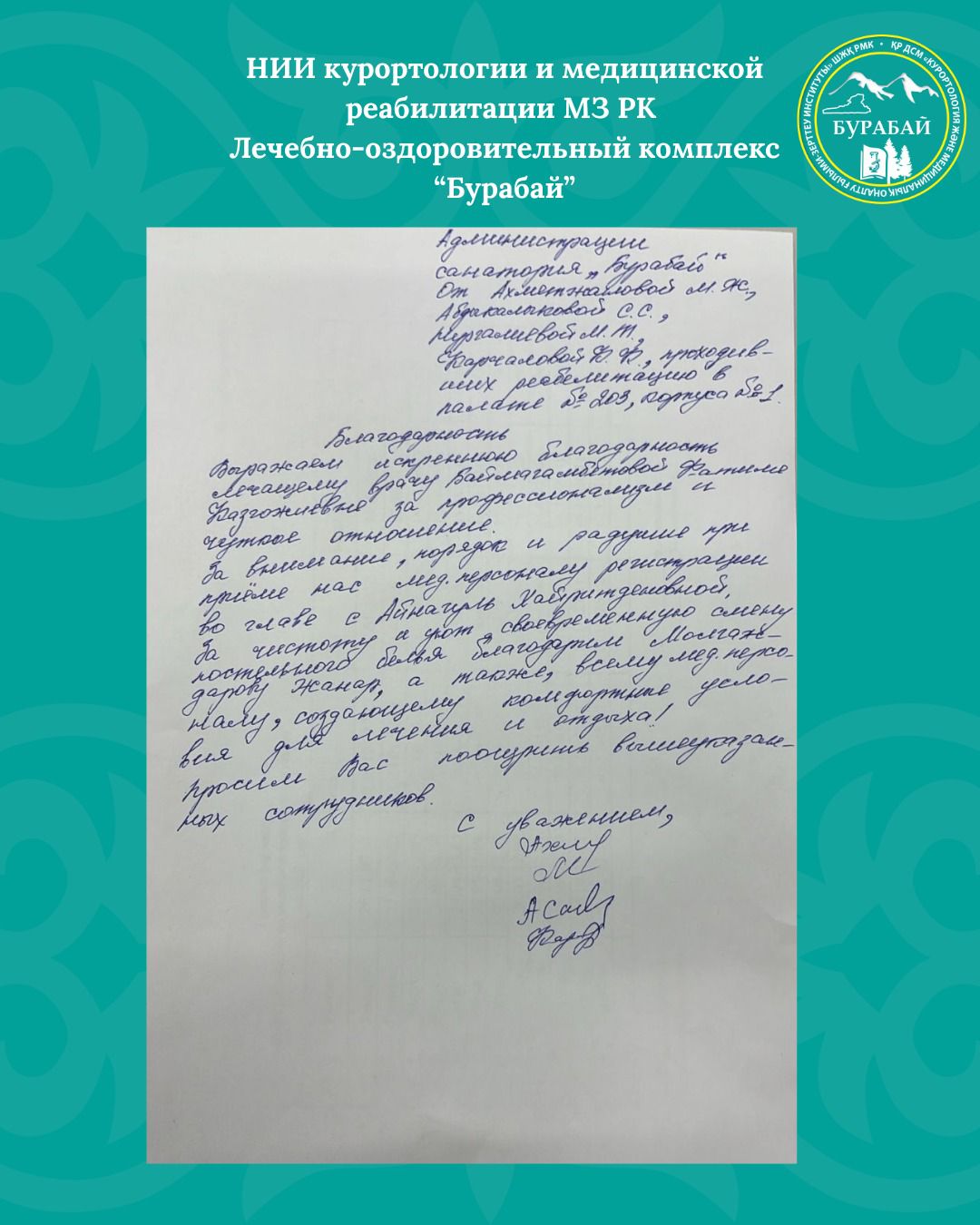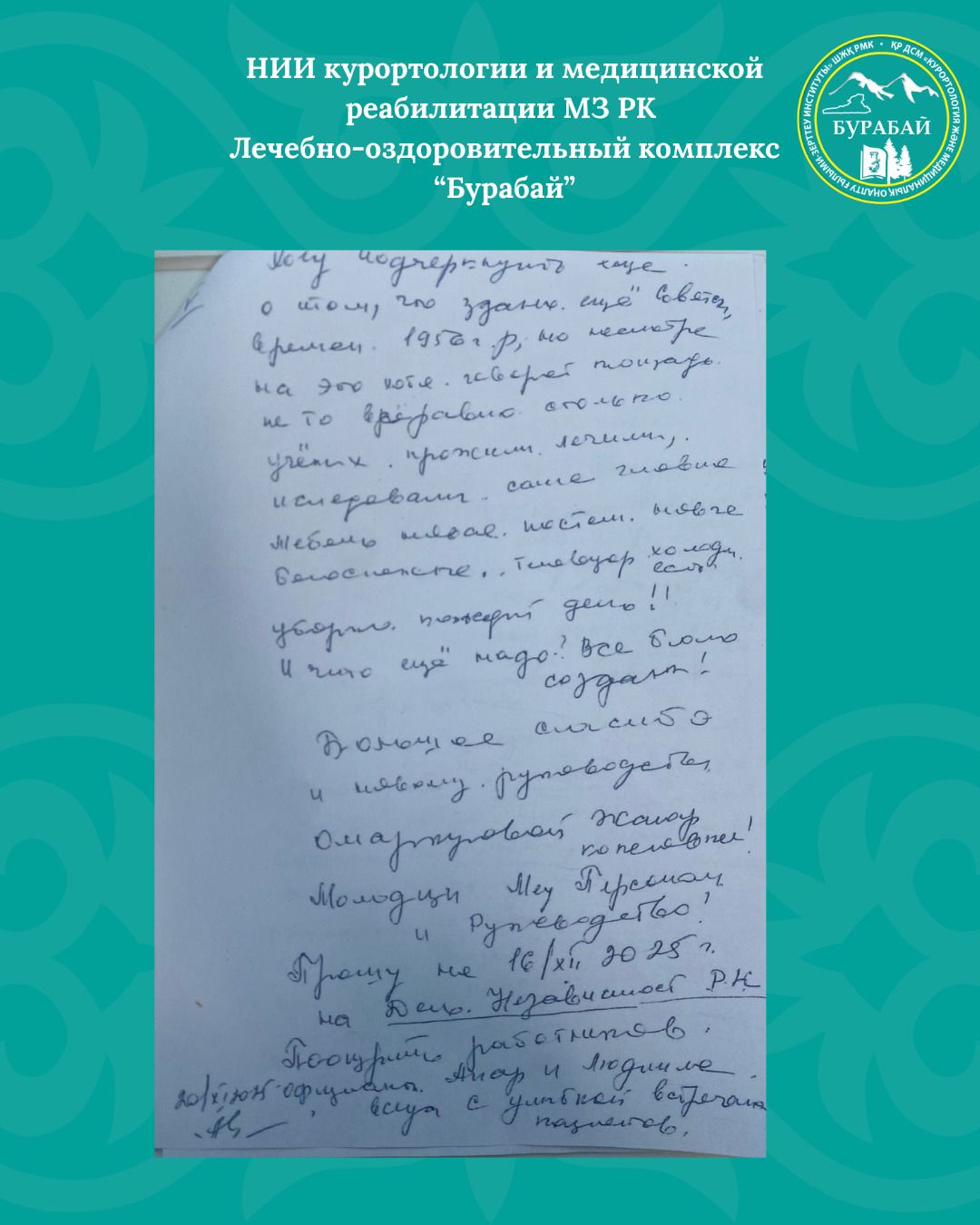 At the branch of the Research Institute of Balneology and Medical Rehabilitation of the Ministry of Health of the Republic of Kazakhstan in the Burabay medical and wellness complex, treatment will be combined with a full rest. It is especially pleasant when our guests share their warm wishes. Today we are publishing letters from patients who have successfully completed treatment. Thank you for choosing us!