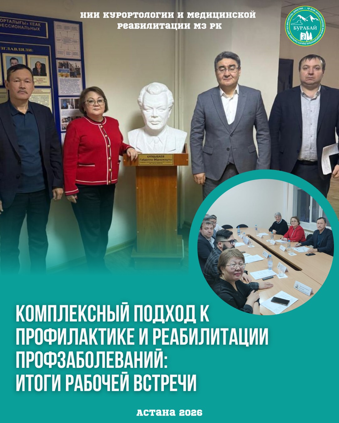 6 января 2026 года состоялась рабочая встреча представителей НИИ курортологии и медицинской реабилитации Министерства здравоохранения Республики Казахстан и НАО «Национальный центр гигиены труда и профессиональных заболеваний» в рамках реализации научного проекта «Комплексный подход к медицинской профилактике и реабилитации профессиональных заболеваний бронхолёгочной системы пылевой этиологии».