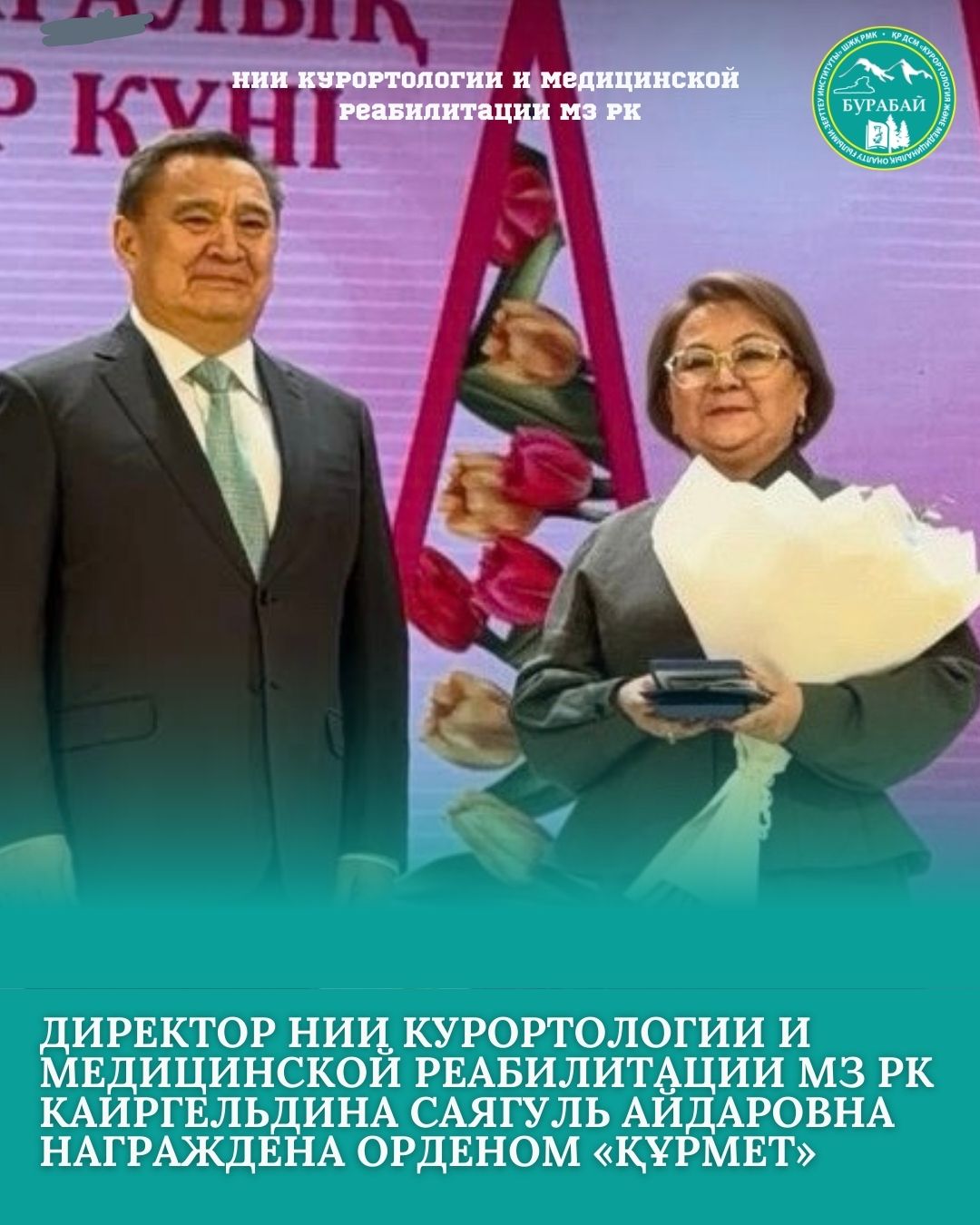 Директор НИИ курортологии и медицинской реабилитации МЗ РК Каиргельдина Саягуль Айдаровна Указом Президента Республики Казахстан от 3 марта 2026 года награждена государственной наградой — орденом «Құрмет».